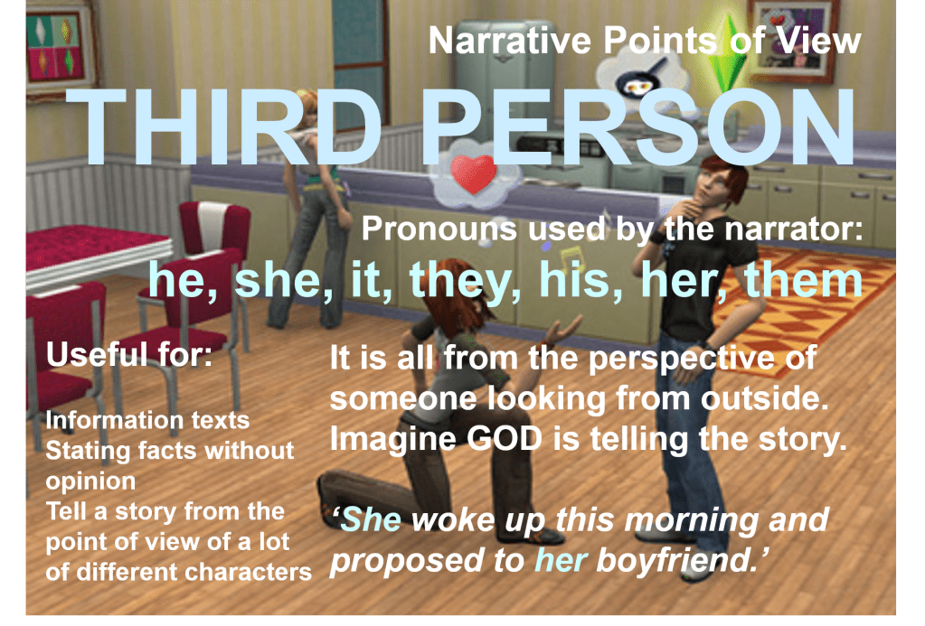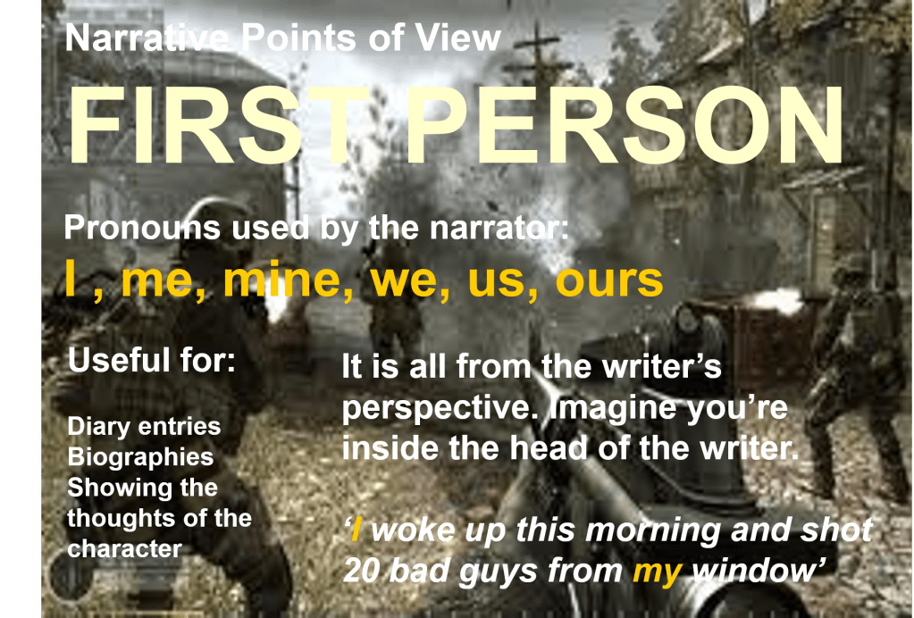 | First Person | Pronouns: I, me, my, mine, ours, we. First person tells us the thinking inside the head of the character or author. I woke up this morning and went to the shops. I saw Sarah there. | The reader or viewer easily connects emotionally with the character. Know their motivations, thinking and ideas more easily. But it makes it harder to see what other characters are experiencing, and harder to see the bigger picture. |