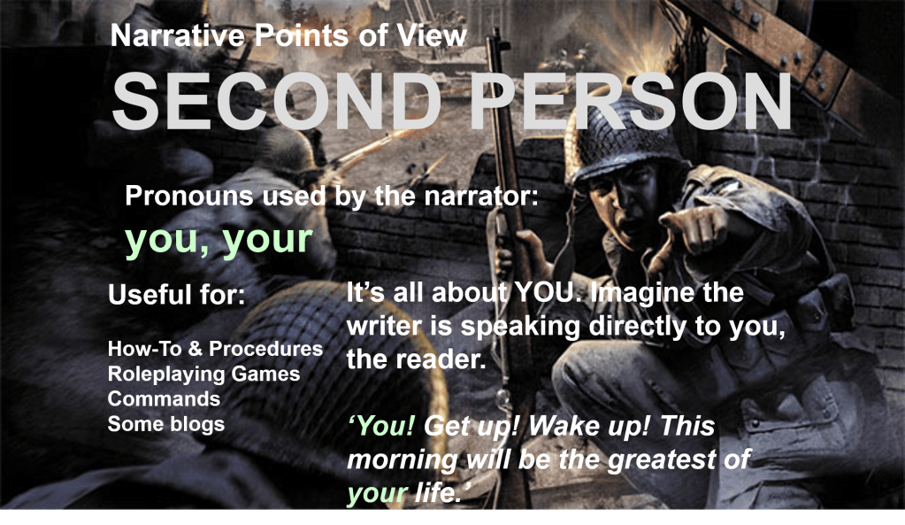 | Second Person | Pronouns: You, your Second person is used for instructions or talking directly to the audience. You, dear reader, know what’s really happening. Clean up your room. Mix three cups of flour with water. | Used mostly for giving instructions in how tos and procedures. Not used for narratives often except when ‘breaking the fourth wall’. |